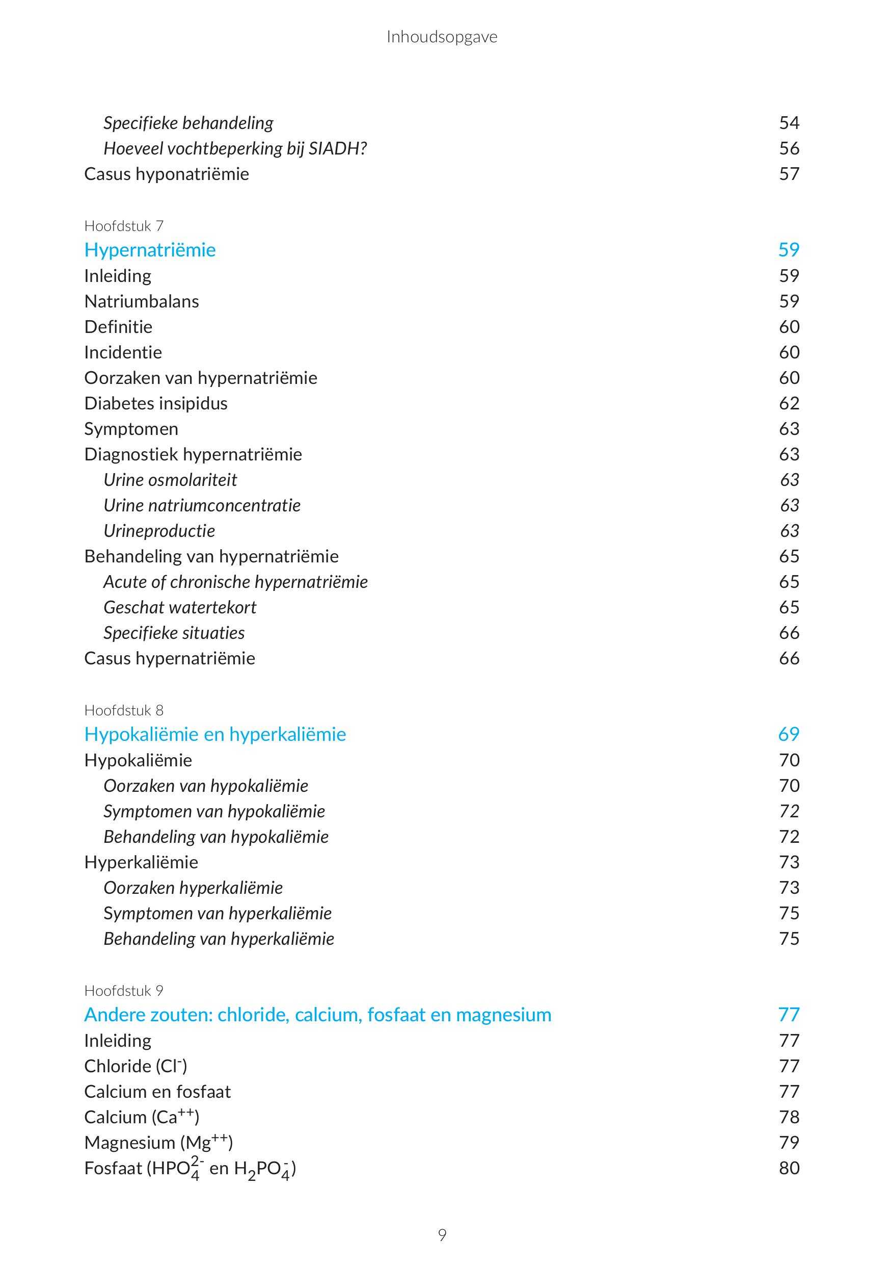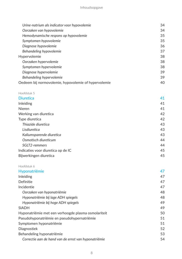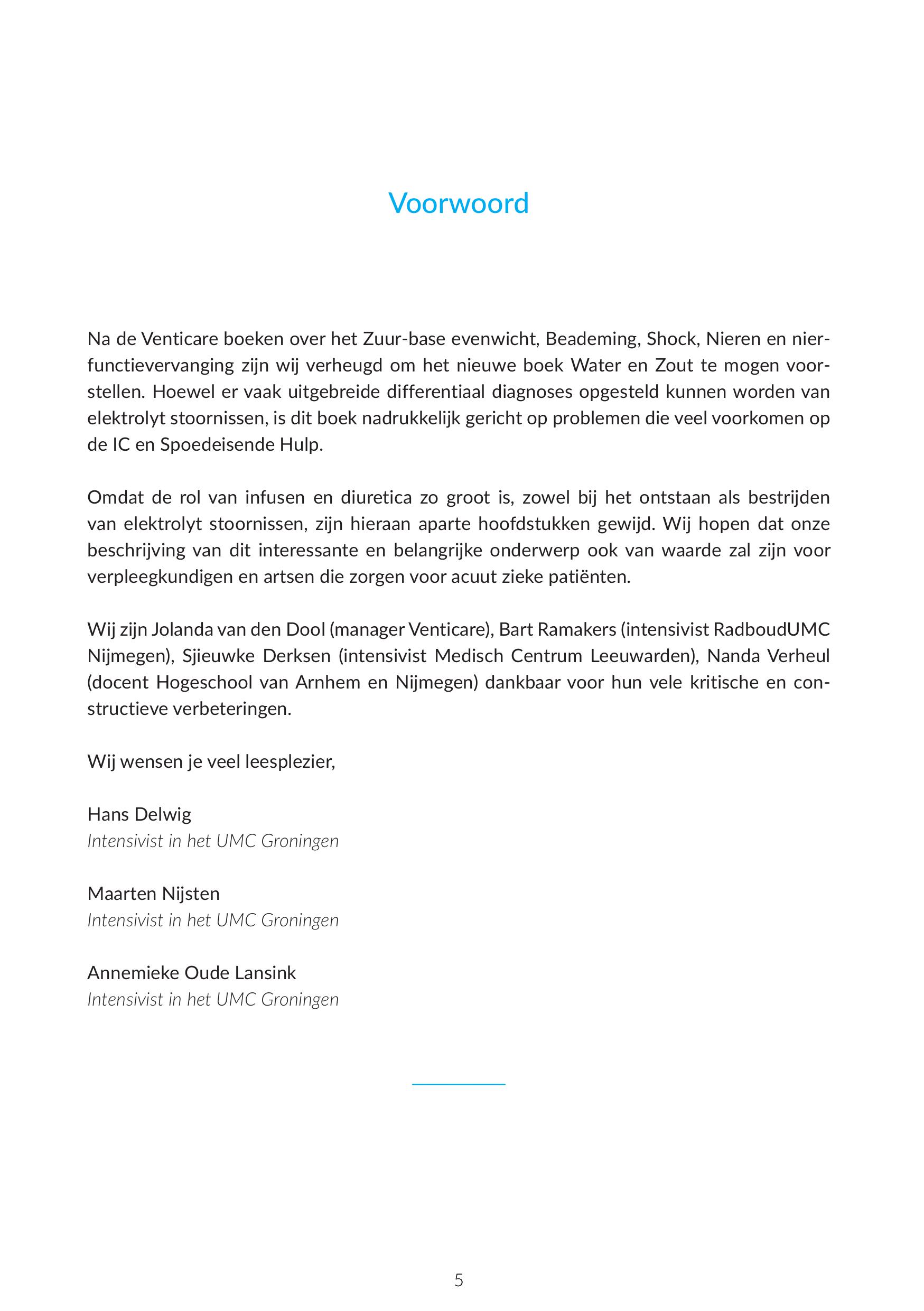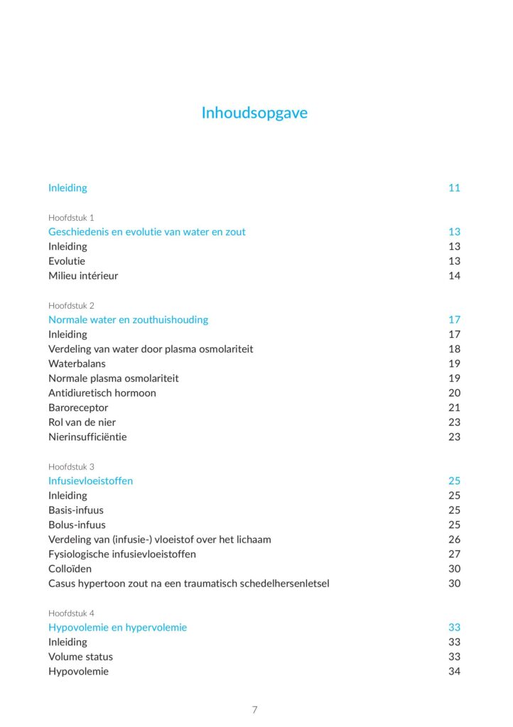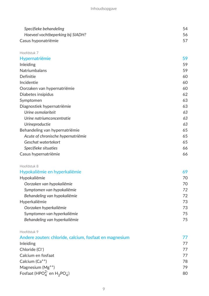 Stoornissen in de vocht- en elektrolythuishouding komen veel voor bij acuut zieke patiënten. Het is van groot belang om basale kennis over water en zout toe te passen bij de diagnostiek en behandeling van patiënten, om met name iatrogene factoren te verminderen. De rol van infuusvloeistoffen en diuretica wordt toegelicht. ‘Water en zout’ gaat met herkenbare praktijkvoorbeelden in op de problematiek van stoornissen in vocht en elektrolyten. Met deze praktische handleiding op zak kunnen de meeste problemen met water en zout adequaat worden behandeld.
